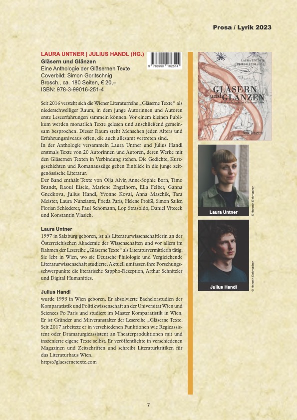 Im April 2023 erschien Gläsern und Glänzen. Eine Anthologie der Gläsernen Texte, herausgegeben von Laura Untner und Julius Handl, in der edition lex liszt 12. Darin werden 20 lyrische und prosaische Arbeiten von Autor_innen versammelt, deren Werke mit den Gläsernen Texten in Verbindung stehen.
